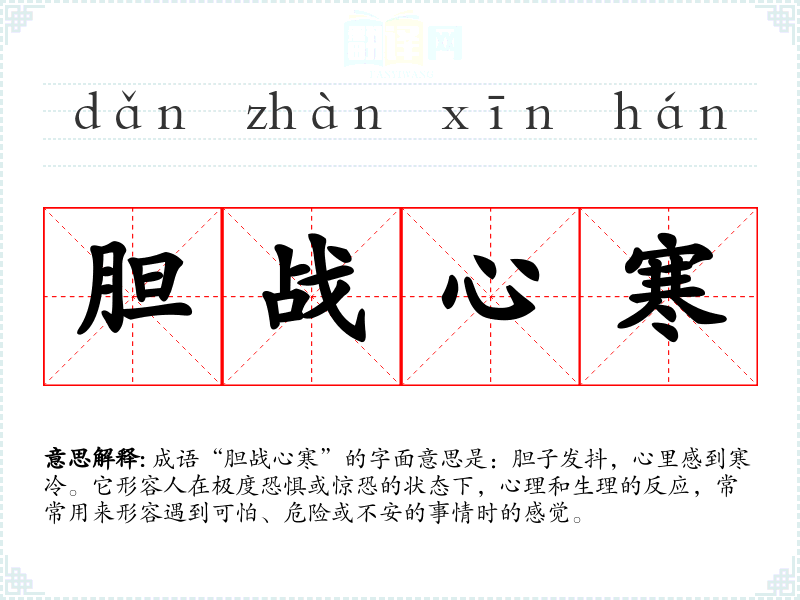 成语“胆战心寒”的字面意思是:胆子发抖,心里感到寒冷。它形容人在极度恐惧或惊恐的状态下,心理和生理的反应,常常用来形容遇到可怕、危险或不安的事情时的感觉。