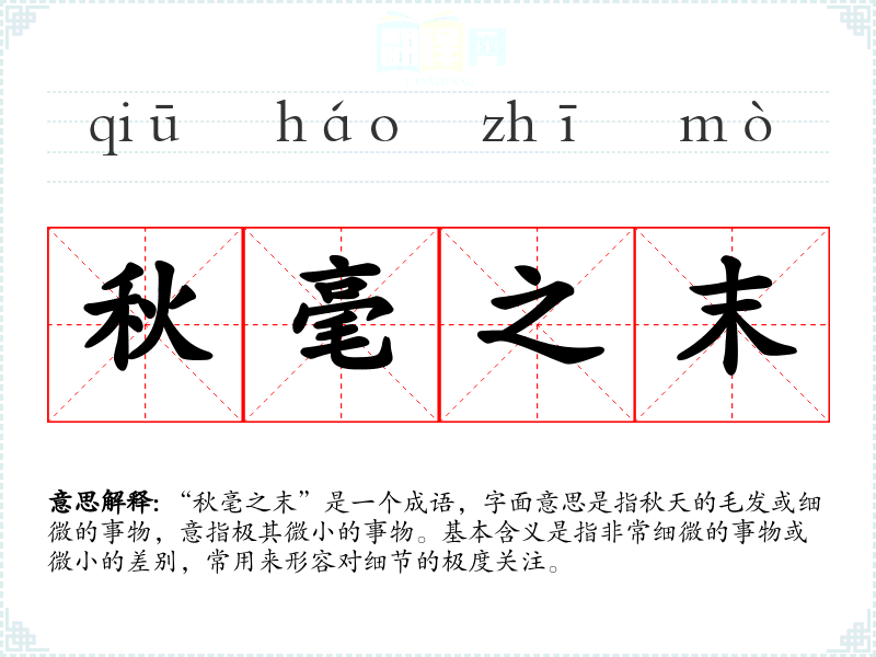 “秋毫之末”是一个成语,字面意思是指秋天的毛发或细微的事物,意指极其微小的事物。基本含义是指非常细微的事物或微小的差别,常用来形容对细节的极度关注。