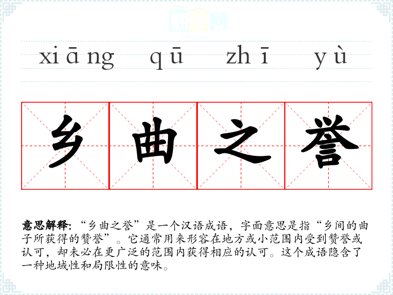 “乡曲之誉”是一个汉语成语,字面意思是指“乡间的曲子所获得的赞誉”。它通常用来形容在地方或小范围内受到赞誉或认可,却未必在更广泛的范围内获得相应的认可。这个成语隐含了一种地域性和局限性的意味。