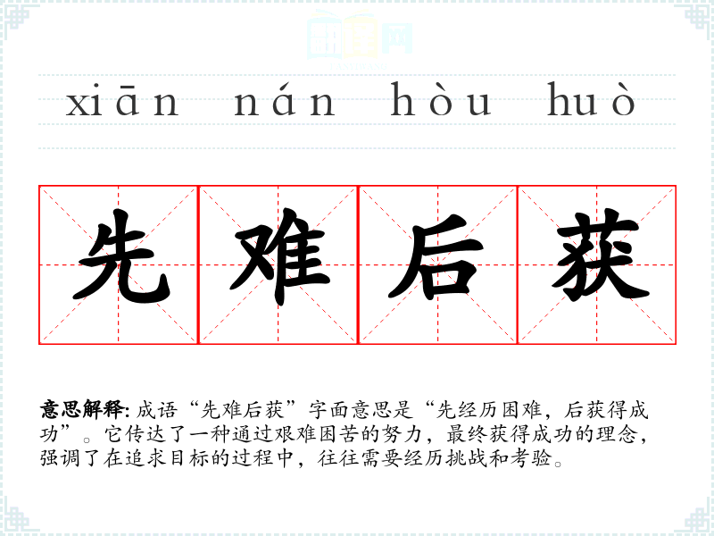 成语“先难后获”字面意思是“先经历困难,后获得成功”。它传达了一种通过艰难困苦的努力,最终获得成功的理念,强调了在追求目标的过程中,往往需要经历挑战和考验。