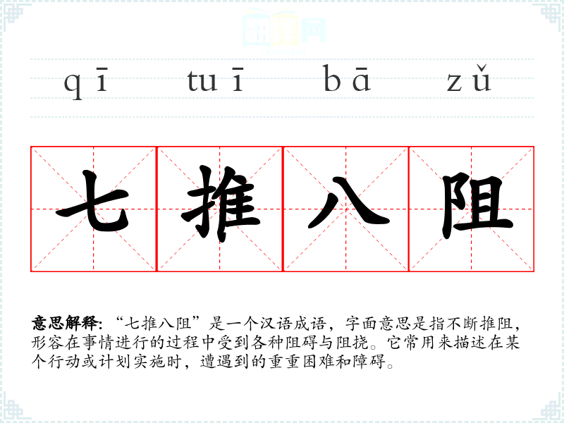 “七推八阻”是一个汉语成语,字面意思是指不断推阻,形容在事情进行的过程中受到各种阻碍与阻挠。它常用来描述在某个行动或计划实施时,遭遇到的重重困难和障碍。