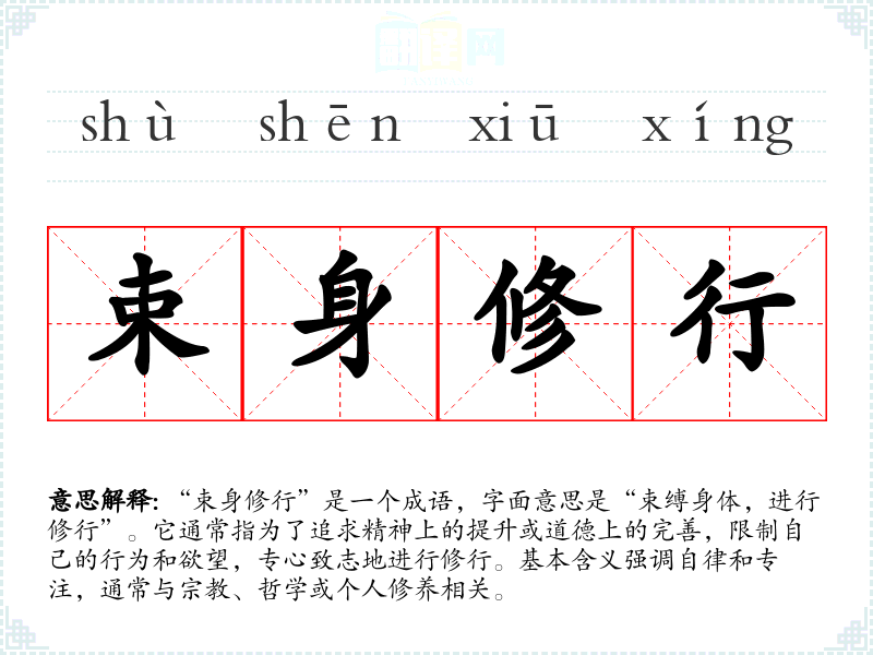 该成语的具体来源并不明确,但其构成的两个词“束身”和“修行”都有悠久的历史。“束身”意指约束自己的身体,反映了古代儒道思想中对自我约束的重视;“修行”则是指通过某种方式提高自身的道德或修养。整体上,“束身修行”体现了古代修道者或思想家追求精神境界的理念。