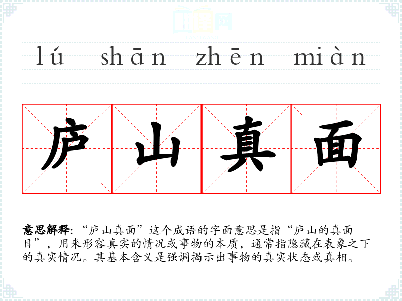 “庐山真面”这个成语的字面意思是指“庐山的真面目”,用来形容真实的情况或事物的本质,通常指隐藏在表象之下的真实情况。其基本含义是强调揭示出事物的真实状态或真相。