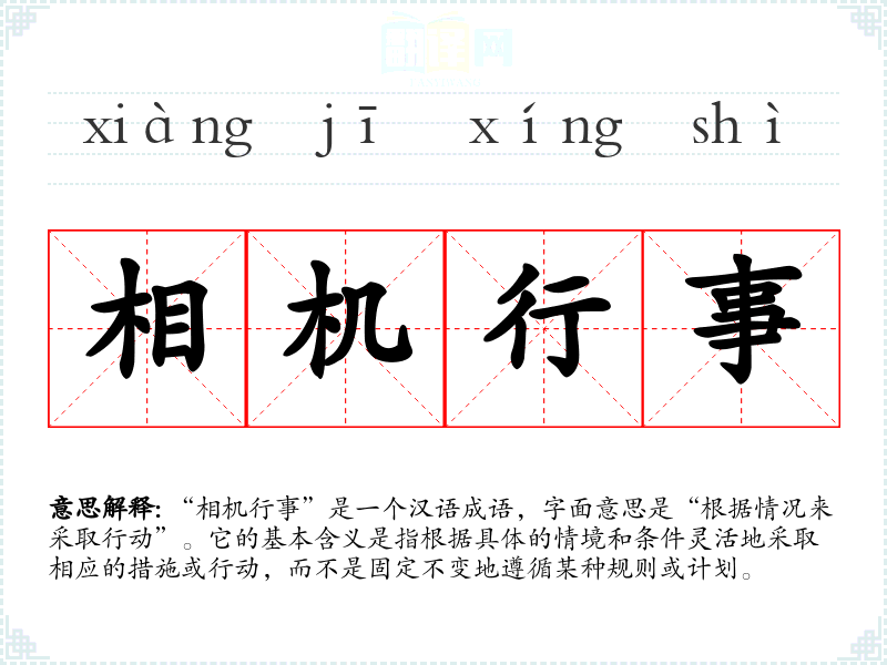 “相机行事”是一个汉语成语,字面意思是“根据情况来采取行动”。它的基本含义是指根据具体的情境和条件灵活地采取相应的措施或行动,而不是固定不变地遵循某种规则或计划。