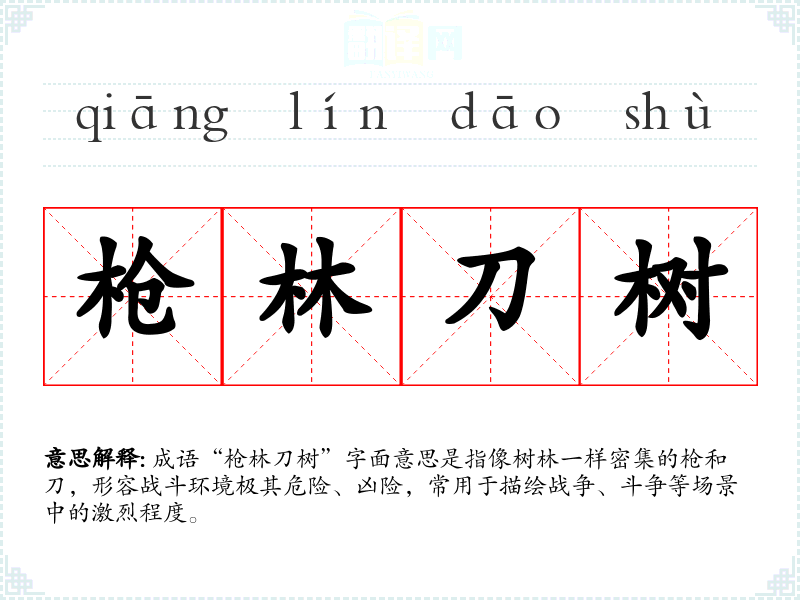 成语“枪林刀树”字面意思是指像树林一样密集的枪和刀,形容战斗环境极其危险、凶险,常用于描绘战争、斗争等场景中的激烈程度。