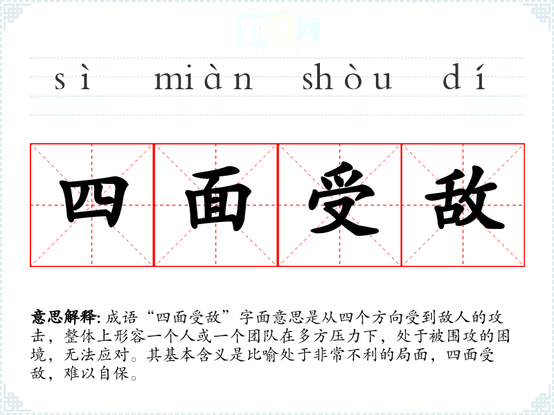 成语“四面受敌”字面意思是从四个方向受到敌人的攻击,整体上形容一个人或一个团队在多方压力下,处于被围攻的困境,无法应对。其基本含义是比喻处于非常不利的局面,四面受敌,难以自保。