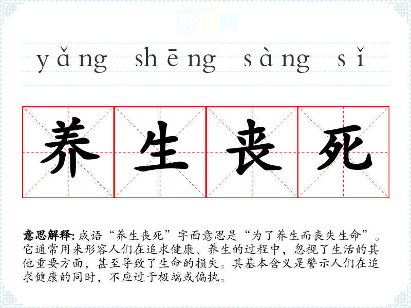 成语“养生丧死”字面意思是“为了养生而丧失生命”。它通常用来形容人们在追求健康、养生的过程中,忽视了生活的其他重要方面,甚至导致了生命的损失。其基本含义是警示人们在追求健康的同时,不应过于极端或偏执。