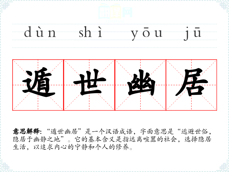 “遁世幽居”是一个汉语成语,字面意思是“逃避世俗,隐居于幽静之地”。它的基本含义是指远离喧嚣的社会,选择隐居生活,以追求内心的宁静和个人的修养。
