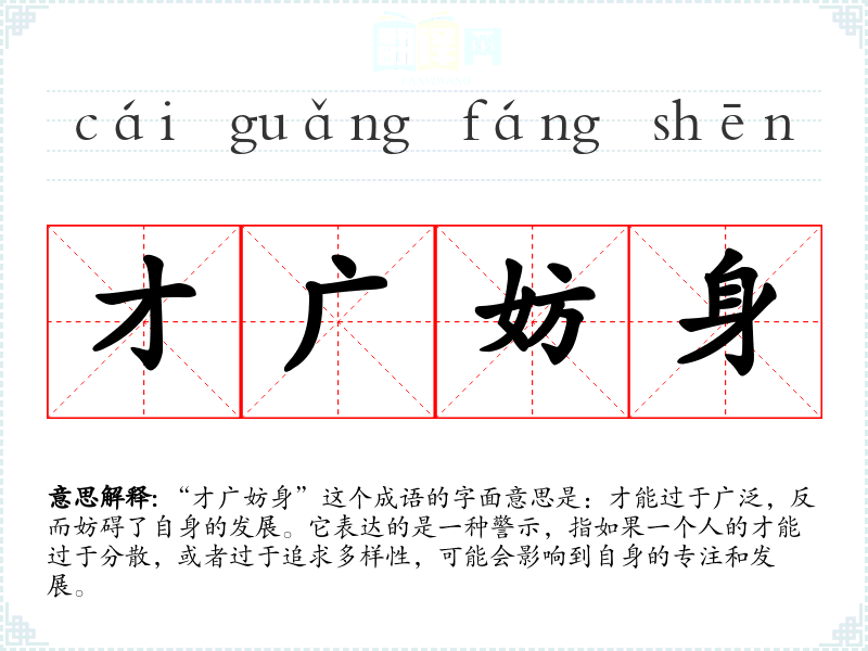 “才广妨身”这个成语的字面意思是:才能过于广泛,反而妨碍了自身的发展。它表达的是一种警示,指如果一个人的才能过于分散,或者过于追求多样性,可能会影响到自身的专注和发展。