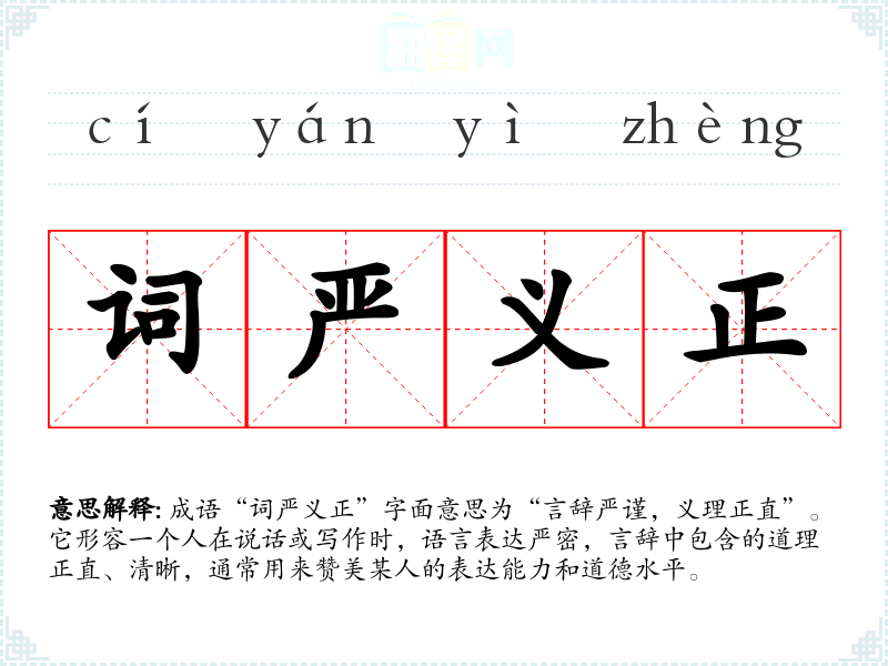 成语“词严义正”字面意思为“言辞严谨,义理正直”。它形容一个人在说话或写作时,语言表达严密,言辞中包含的道理正直、清晰,通常用来赞美某人的表达能力和道德水平。
