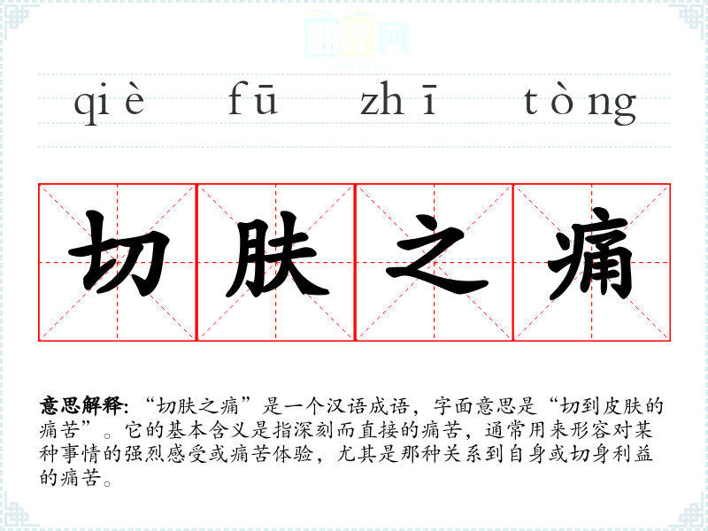 “切肤之痛”是一个汉语成语,字面意思是“切到皮肤的痛苦”。它的基本含义是指深刻而直接的痛苦,通常用来形容对某种事情的强烈感受或痛苦体验,尤其是那种关系到自身或切身利益的痛苦。