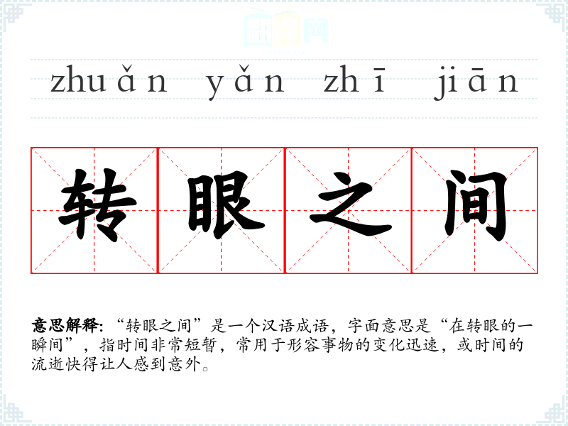 “转眼之间”是一个汉语成语,字面意思是“在转眼的一瞬间”,指时间非常短暂,常用于形容事物的变化迅速,或时间的流逝快得让人感到意外。