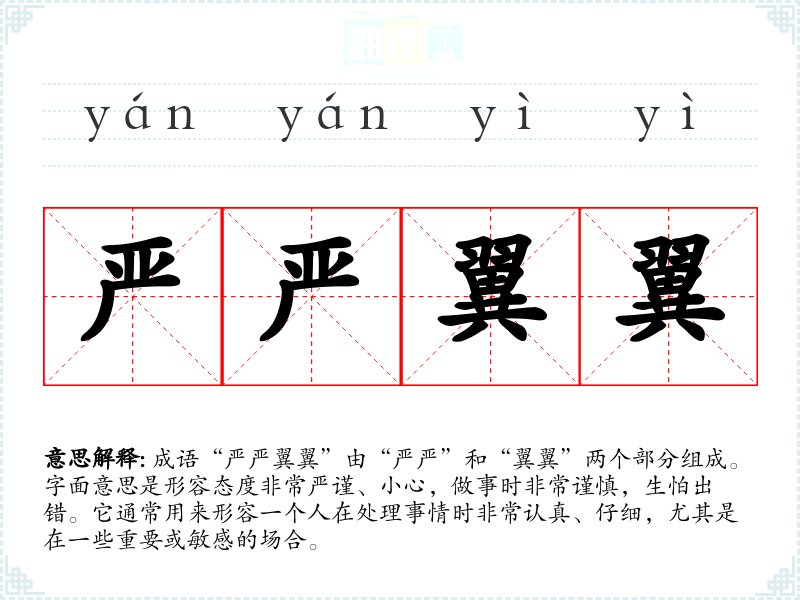成语“严严翼翼”由“严严”和“翼翼”两个部分组成。字面意思是形容态度非常严谨、小心,做事时非常谨慎,生怕出错。它通常用来形容一个人在处理事情时非常认真、仔细,尤其是在一些重要或敏感的场合。