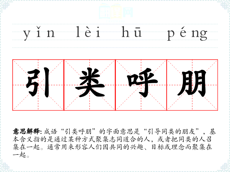 | 引类呼朋 | 引:招来;类:同类;呼:叫。指招引志趣相同的人。 |