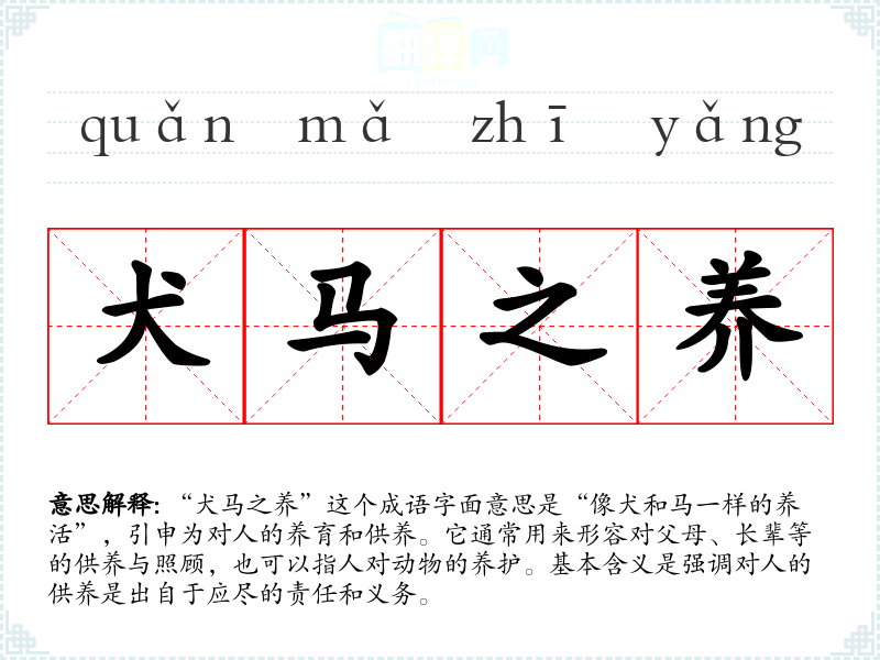 “犬马之养”这个成语字面意思是“像犬和马一样的养活”,引申为对人的养育和供养。它通常用来形容对父母、长辈等的供养与照顾,也可以指人对动物的养护。基本含义是强调对人的供养是出自于应尽的责任和义务。