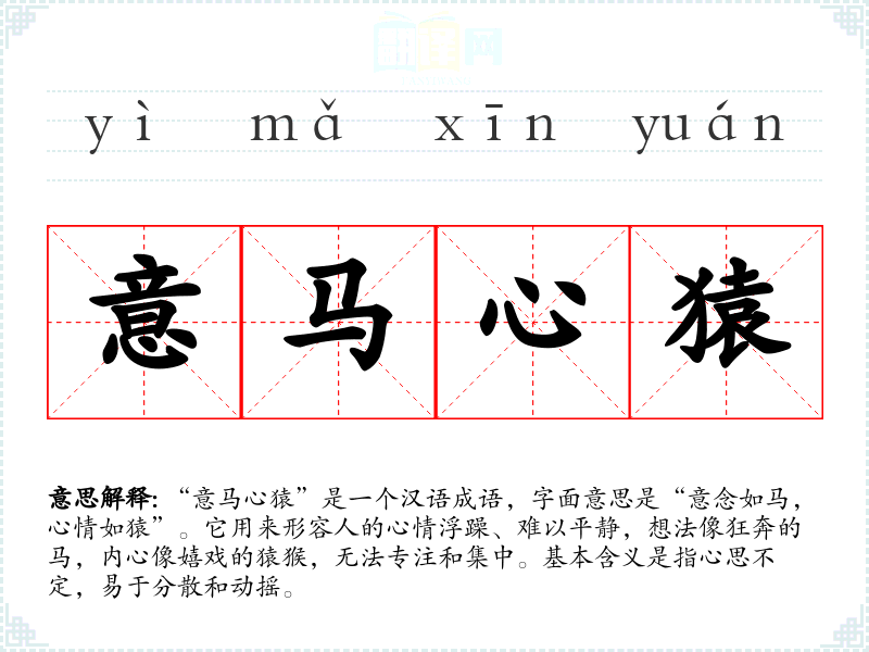 “意马心猿”是一个汉语成语,字面意思是“意念如马,心情如猿”。它用来形容人的心情浮躁、难以平静,想法像狂奔的马,内心像嬉戏的猿猴,无法专注和集中。基本含义是指心思不定,易于分散和动摇。