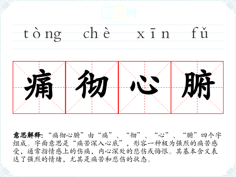 “痛彻心腑”由“痛”、“彻”、“心”、“腑”四个字组成。字面意思是“痛苦深入心底”,形容一种极为强烈的痛苦感受,通常指情感上的伤痛,内心深处的悲伤或悔恨。其基本含义表达了强烈的情绪,尤其是痛苦和悲伤的状态。