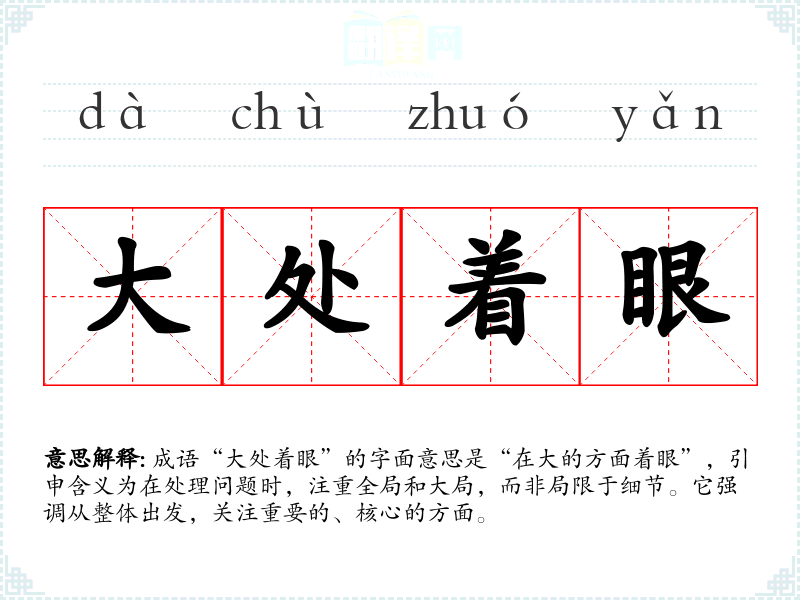成语“大处着眼”的字面意思是“在大的方面着眼”,引申含义为在处理问题时,注重全局和大局,而非局限于细节。它强调从整体出发,关注重要的、核心的方面。