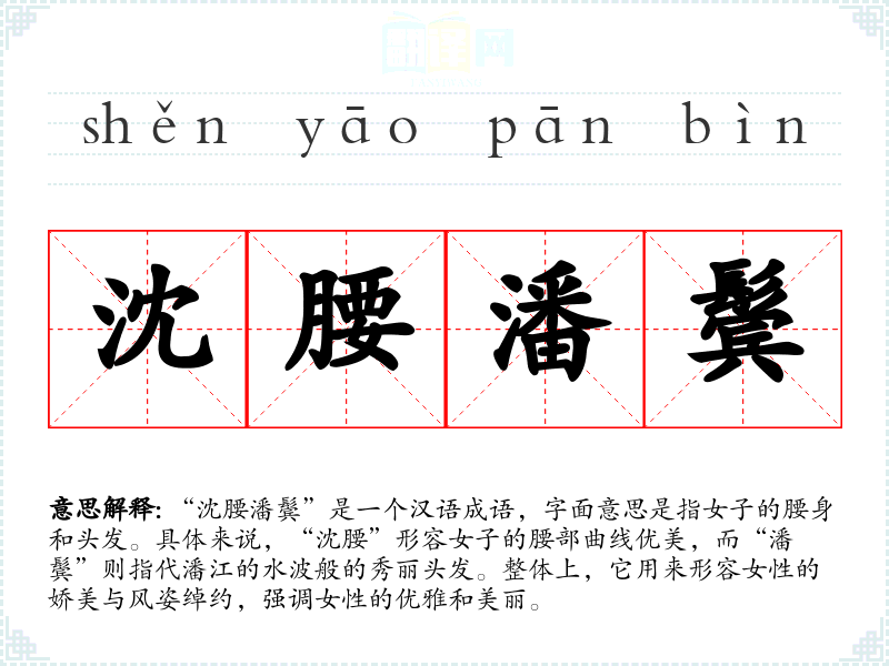 “沈腰潘鬓”源于**古代文人对女性美的描绘,特别是在唐诗与宋词中,常常会用这样的词汇来表达对女性的赞美。沈、潘二字分别来自于历史上著名的美人,如沈妃与潘江,传达出一种古典美的意象。具体的来源可能涉及到古代文人的诗句与文学作品,体现出对女性美的欣赏。