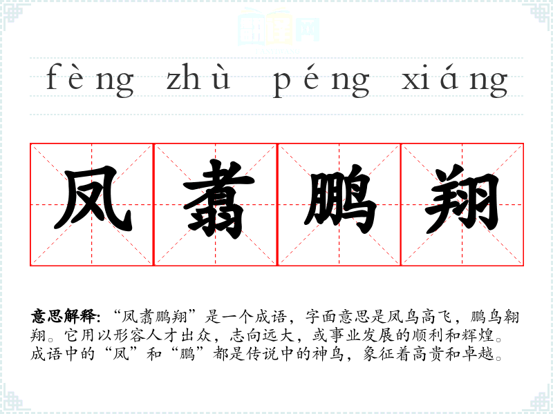 “凤翥鹏翔”是一个成语,字面意思是凤鸟高飞,鹏鸟翱翔。它用以形容人才出众,志向远大,或事业发展的顺利和辉煌。成语中的“凤”和“鹏”都是传说中的神鸟,象征着高贵和卓越。