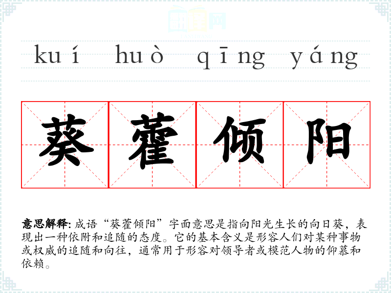 成语“葵藿倾阳”字面意思是指向阳光生长的向日葵,表现出一种依附和追随的态度。它的基本含义是形容人们对某种事物或权威的追随和向往,通常用于形容对领导者或模范人物的仰慕和依赖。