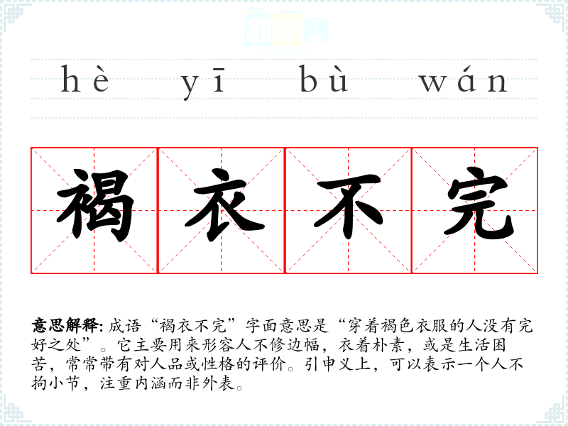 成语“褐衣不完”字面意思是“穿着褐色衣服的人没有完好之处”。它主要用来形容人不修边幅,衣着朴素,或是生活困苦,常常带有对人品或性格的评价。引申义上,可以表示一个人不拘小节,注重内涵而非外表。