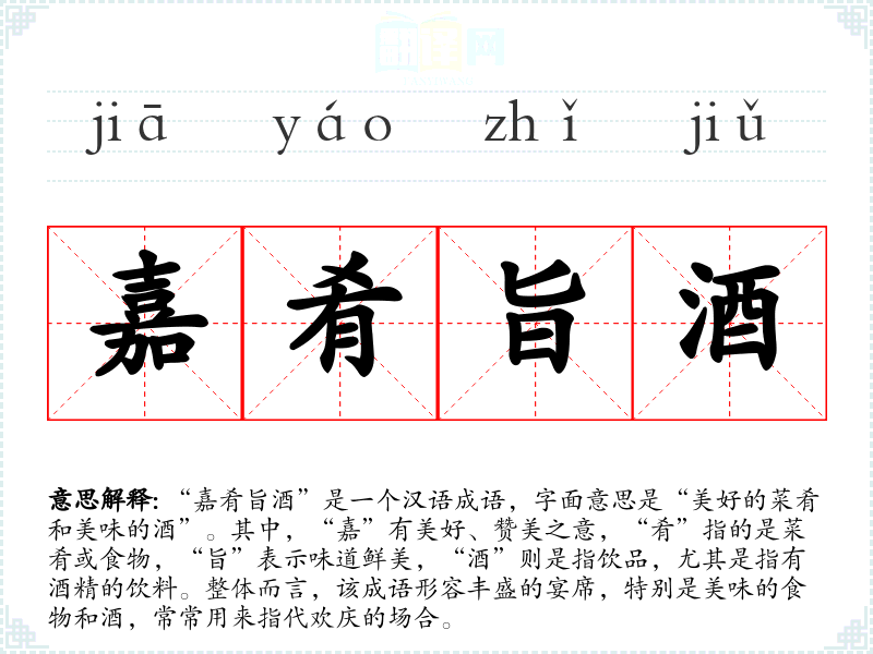 “嘉肴旨酒”是一个汉语成语,字面意思是“美好的菜肴和美味的酒”。其中,“嘉”有美好、赞美之意,“肴”指的是菜肴或食物,“旨”表示味道鲜美,“酒”则是指饮品,尤其是指有酒精的饮料。整体而言,该成语形容丰盛的宴席,特别是美味的食物和酒,常常用来指代欢庆的场合。