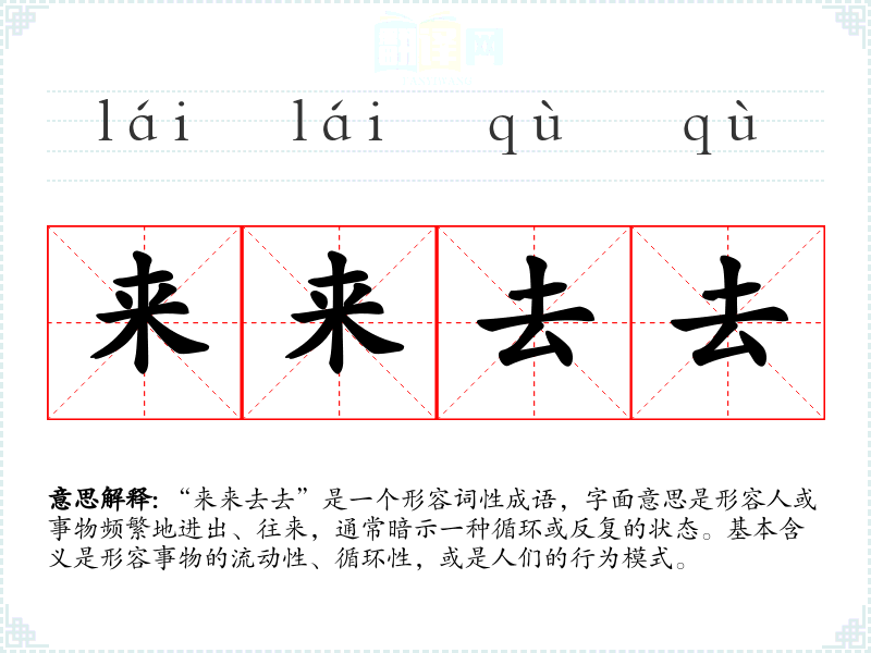 “来来去去”是一个形容词性成语,字面意思是形容人或事物频繁地进出、往来,通常暗示一种循环或反复的状态。基本含义是形容事物的流动性、循环性,或是人们的行为模式。