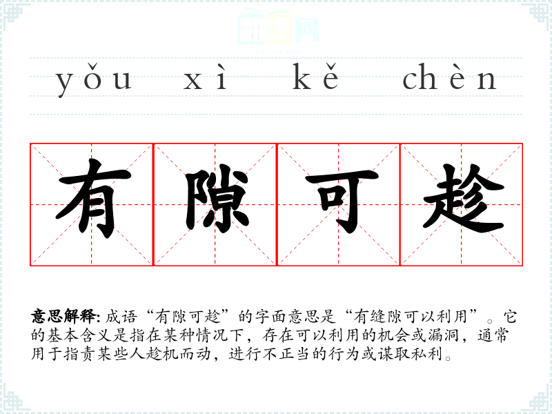成语“有隙可趁”的字面意思是“有缝隙可以利用”。它的基本含义是指在某种情况下,存在可以利用的机会或漏洞,通常用于指责某些人趁机而动,进行不正当的行为或谋取私利。