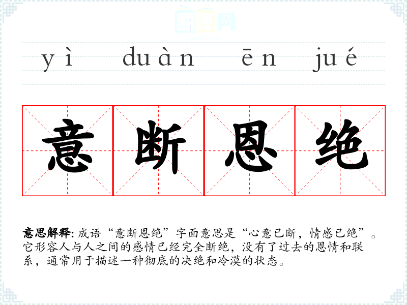 成语“意断恩绝”字面意思是“心意已断,情感已绝”。它形容人与人之间的感情已经完全断绝,没有了过去的恩情和联系,通常用于描述一种彻底的决绝和冷漠的状态。
