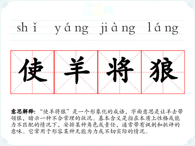 | 使羊将狼 | 将:统率,指挥。派羊去指挥狼。比喻不足以统率指挥。也比喻使仁厚的人去驾驭强横而有野心的人,这要坏事。 |