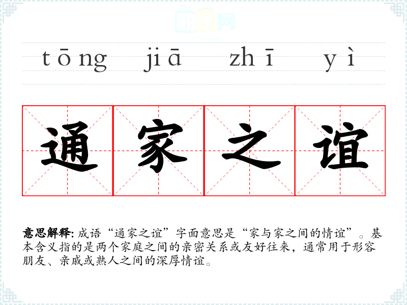 成语“通家之谊”字面意思是“家与家之间的情谊”。基本含义指的是两个家庭之间的亲密关系或友好往来,通常用于形容朋友、亲戚或熟人之间的深厚情谊。