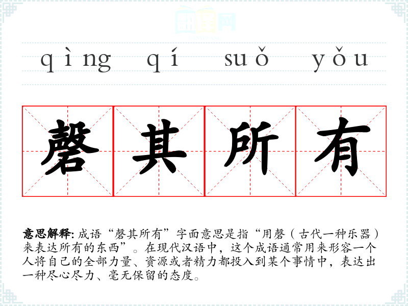 成语“磬其所有”字面意思是指“用磬(古代一种乐器)来表达所有的东西”。在现代汉语中,这个成语通常用来形容一个人将自己的全部力量、资源或者精力都投入到某个事情中,表达出一种尽心尽力、毫无保留的态度。