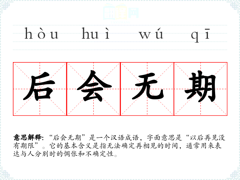 “后会无期”是一个汉语成语,字面意思是“以后再见没有期限”。它的基本含义是指无法确定再相见的时间,通常用来表达与人分别时的惆怅和不确定性。