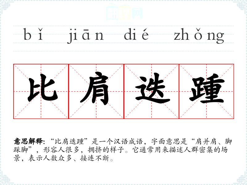 “比肩迭踵”是一个汉语成语,字面意思是“肩并肩、脚踩脚”,形容人很多,拥挤的样子。它通常用来描述人群密集的场景,表示人数众多、接连不断。