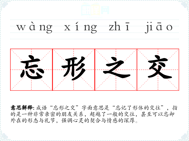 成语“忘形之交”字面意思是“忘记了形体的交往”,指的是一种非常亲密的朋友关系,超越了一般的交往,甚至可以忘却外在的形态与礼节,强调心灵的契合与情感的深厚。