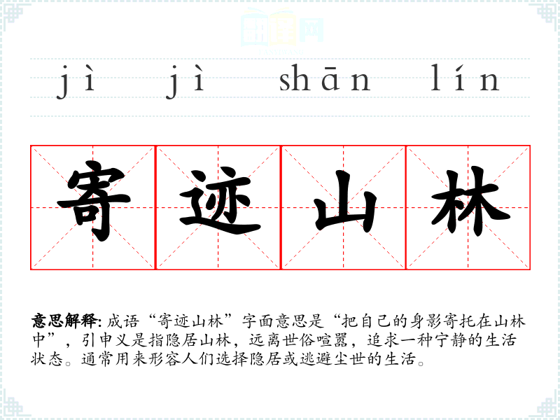 成语“寄迹山林”字面意思是“把自己的身影寄托在山林中”,引申义是指隐居山林,远离世俗喧嚣,追求一种宁静的生活状态。通常用来形容人们选择隐居或逃避尘世的生活。