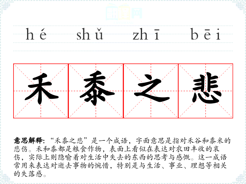 - 反义成语:如“喜气洋洋”,表示欢快与喜悦的情绪,与禾黍之悲形成鲜明对比。