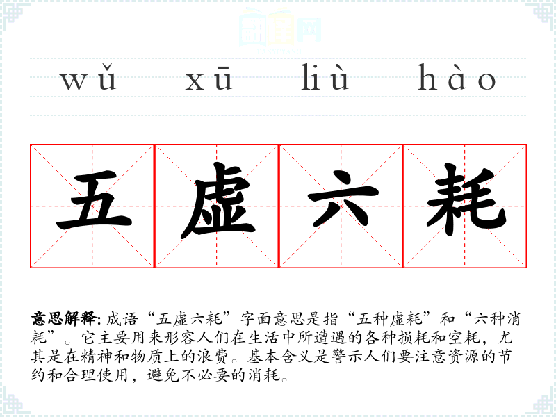 成语“五虚六耗”字面意思是指“五种虚耗”和“六种消耗”。它主要用来形容人们在生活中所遭遇的各种损耗和空耗,尤其是在精神和物质上的浪费。基本含义是警示人们要注意资源的节约和合理使用,避免不必要的消耗。