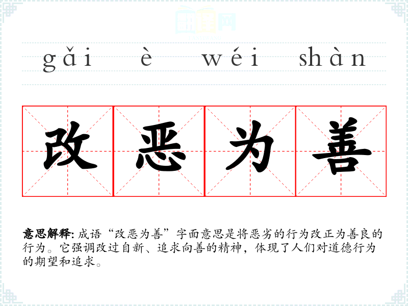 成语“改恶为善”字面意思是将恶劣的行为改正为善良的行为。它强调改过自新、追求向善的精神,体现了人们对道德行为的期望和追求。