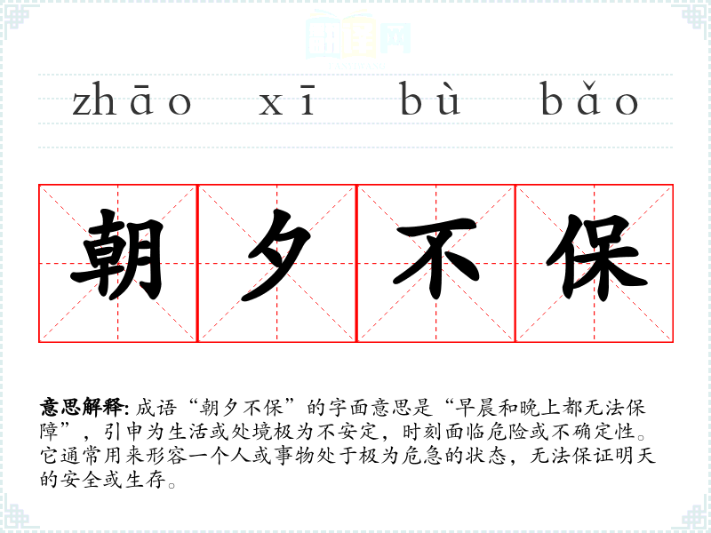 成语“朝夕不保”的字面意思是“早晨和晚上都无法保障”,引申为生活或处境极为不安定,时刻面临危险或不确定性。它通常用来形容一个人或事物处于极为危急的状态,无法保证明天的安全或生存。