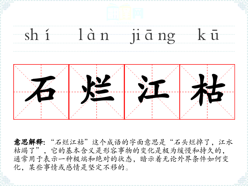 “石烂江枯”这个成语的字面意思是“石头烂掉了,江水枯竭了”,它的基本含义是形容事物的变化是极为缓慢和持久的,通常用于表示一种极端和绝对的状态,暗示着无论外界条件如何变化,某些事情或感情是坚定不移的。