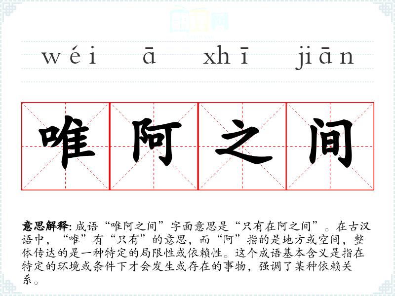 成语“唯阿之间”字面意思是“只有在阿之间”。在古汉语中,“唯”有“只有”的意思,而“阿”指的是地方或空间,整体传达的是一种特定的局限性或依赖性。这个成语基本含义是指在特定的环境或条件下才会发生或存在的事物,强调了某种依赖关系。