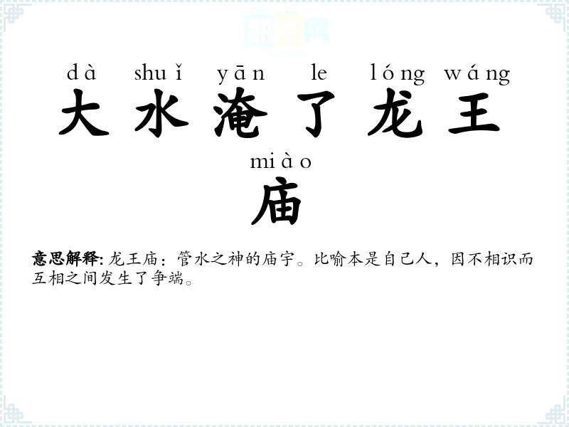 龙王庙:管水之神的庙宇。比喻本是自己人,因不相识而互相之间发生了争端。 |