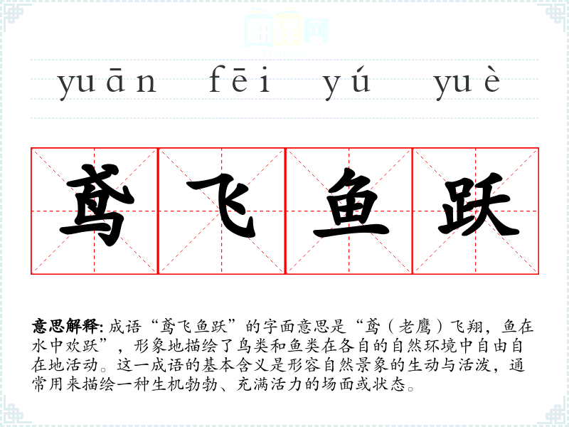 鸢飞鱼跃 鸢:老鹰。鹰在天空飞翔,鱼在水中腾跃。形容万物各得其所。