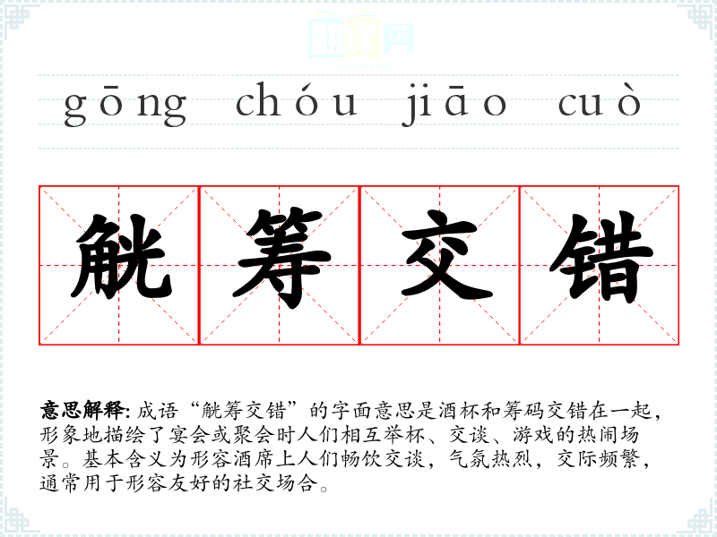 成语“觥筹交错”的字面意思是酒杯和筹码交错在一起,形象地描绘了宴会或聚会时人们相互举杯、交谈、游戏的热闹场景。基本含义为形容酒席上人们畅饮交谈,气氛热烈,交际频繁,通常用于形容友好的社交场合。