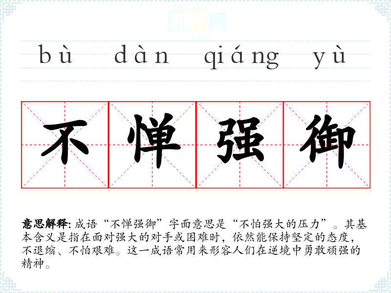 成语“不惮强御”字面意思是“不怕强大的压力”。其基本含义是指在面对强大的对手或困难时,依然能保持坚定的态度,不退缩、不怕艰难。这一成语常用来形容人们在逆境中勇敢顽强的精神。