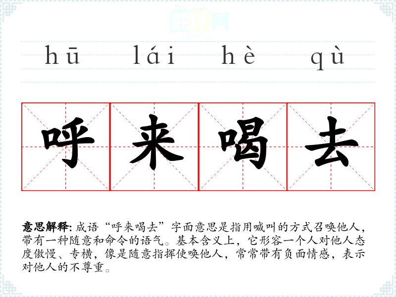 成语“呼来喝去”字面意思是指用喊叫的方式召唤他人,带有一种随意和命令的语气。基本含义上,它形容一个人对他人态度傲慢、专横,像是随意指挥使唤他人,常常带有负面情感,表示对他人的不尊重。