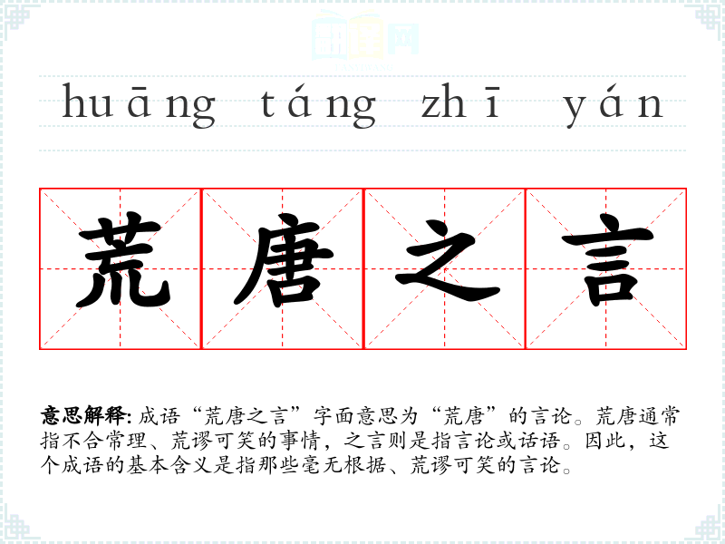 成语“荒唐之言”字面意思为“荒唐”的言论。荒唐通常指不合常理、荒谬可笑的事情,之言则是指言论或话语。因此,这个成语的基本含义是指那些毫无根据、荒谬可笑的言论。