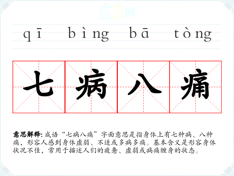 成语“七病八痛”字面意思是指身体上有七种病、八种痛,形容人感到身体虚弱、不适或多病多痛。基本含义是形容身体状况不佳,常用于描述人们的疲惫、虚弱或病痛缠身的状态。